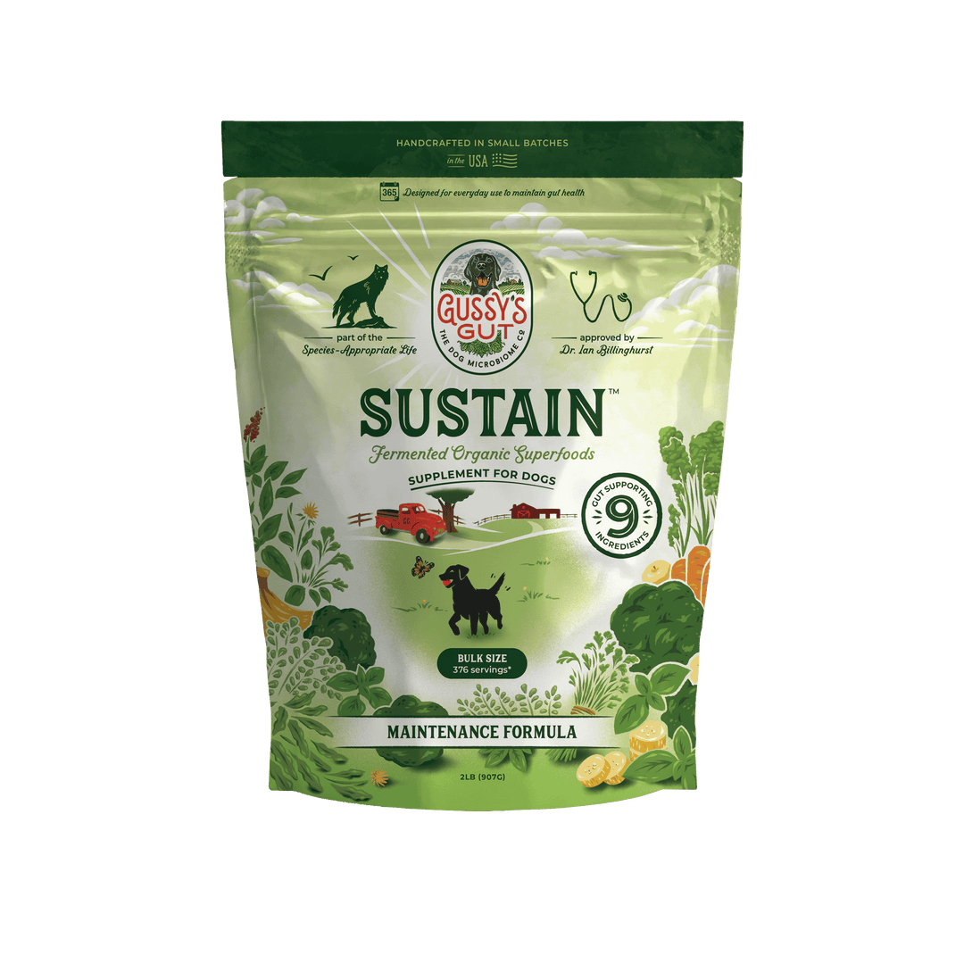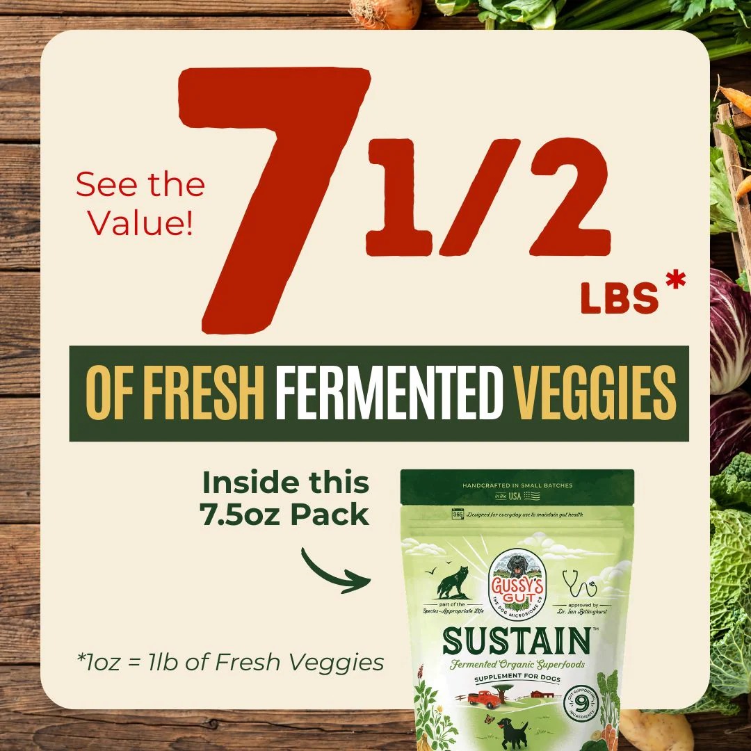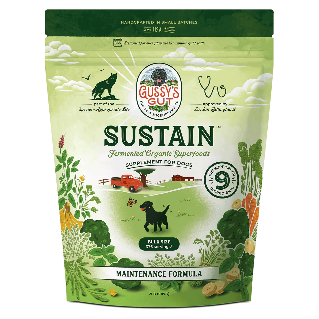 Maintain your pet’s health with Sustain. These 9 ingredients are the right blend of fermented prebiotics and nutrients for great gut support year round. √ 100% organic, clean and fermented √ Made in the USA √ 7.5oz = 88 servings. 2lb. size = 376 servings.