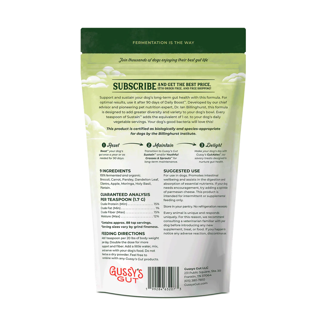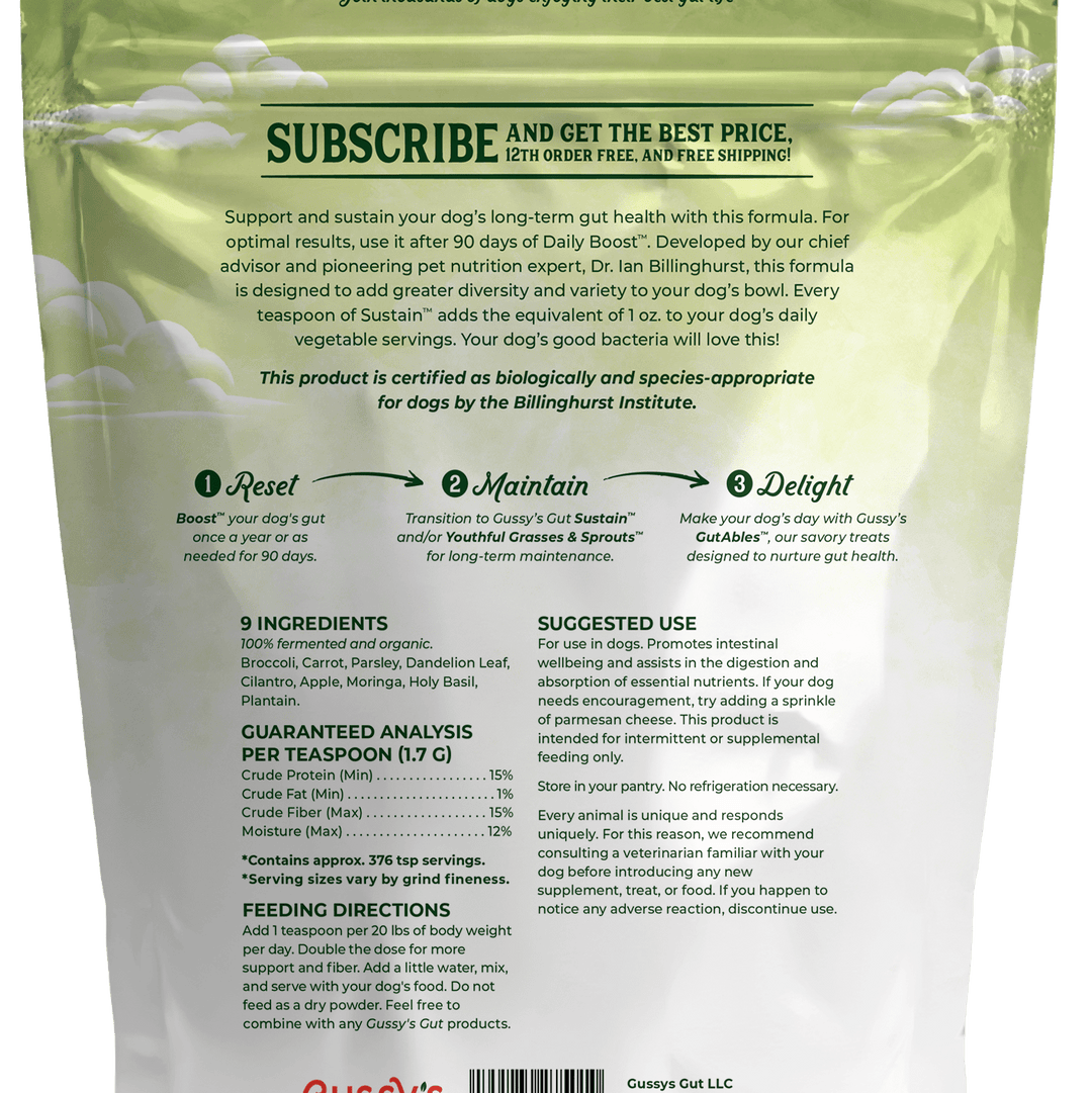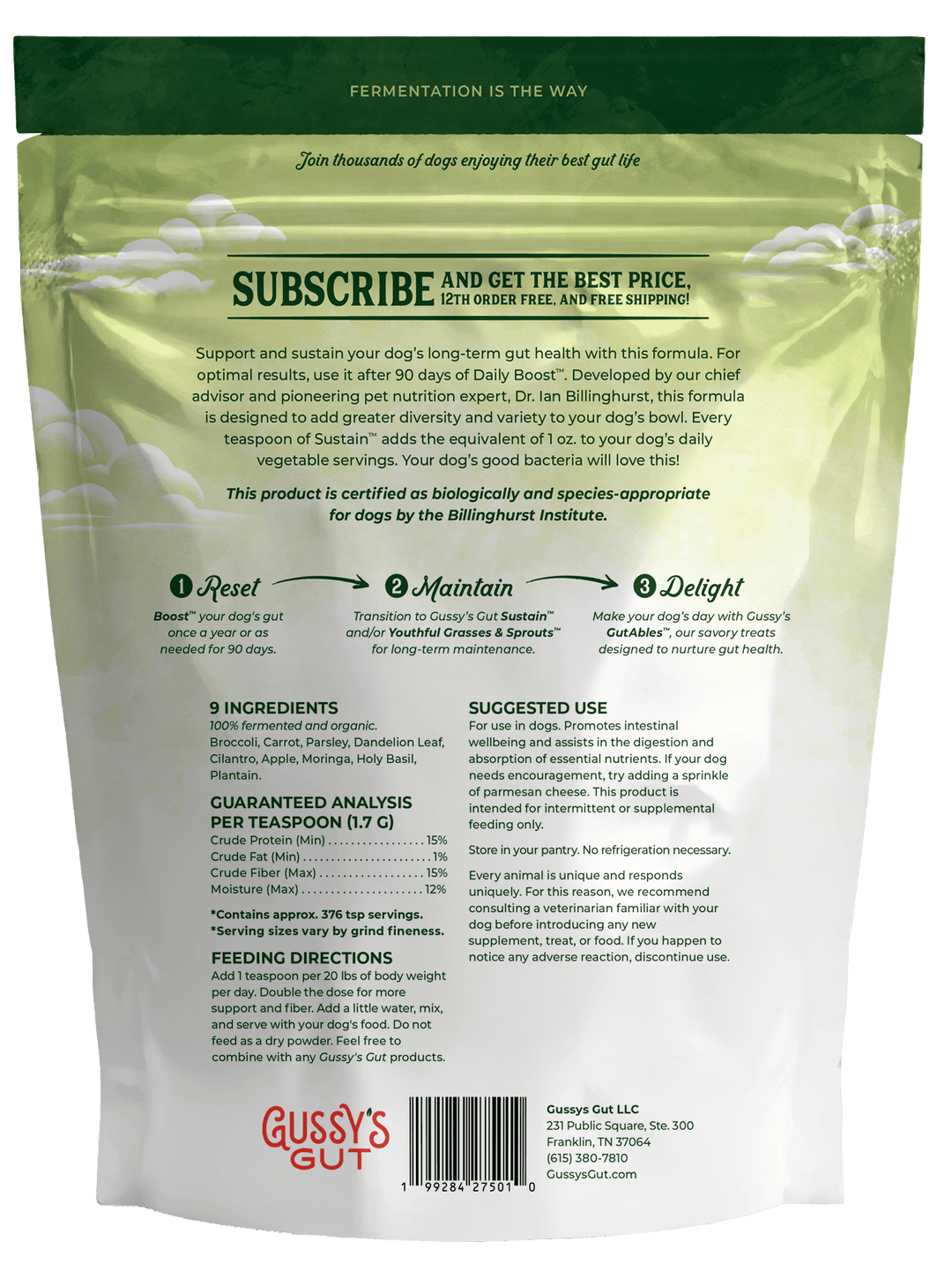 Maintain your pet’s health with Sustain. These 9 ingredients are the right blend of fermented prebiotics and nutrients for great gut support year round. √ 100% organic, clean and fermented √ Made in the USA √ 7.5oz = 88 servings. 2lb. size = 376 servings.